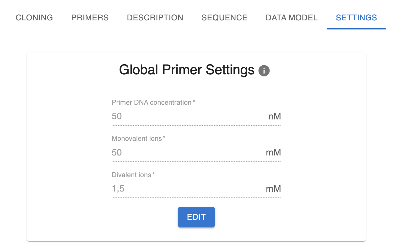 You can set the parameters used to calculate melting temperature and other thermodynamic properties in the primer table and for primer design in the Settings tab.